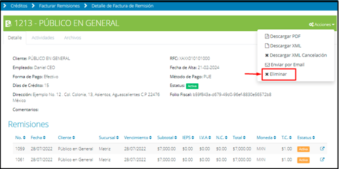 Una vez que hayas generado la nueva factura, regresa a los detalles de la factura original que deseas cancelar con relación. Nuevamente, selecciona la opción “Acciones” y elige “Eliminar”. Esta vez, selecciona la opción de “CFDI”.