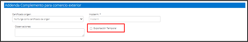 - Exportación Temporal: para que se emita correctamente el complemento este campo debe quedar en blanco.