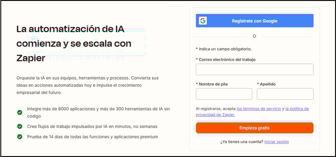 Crea una cuenta en el portal de Zapier. El registro es gratuito y toma menos de 5 minutos.