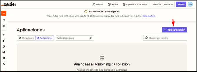- Paso 2: Una vez dentro de tu cuenta, da clic en APP Conexions>“Agregar Conexión!”.