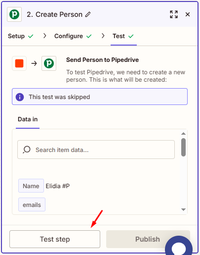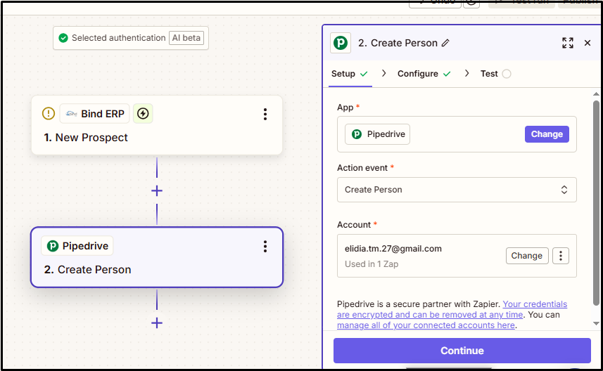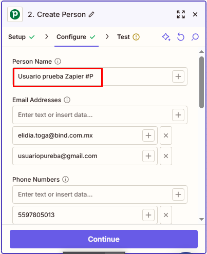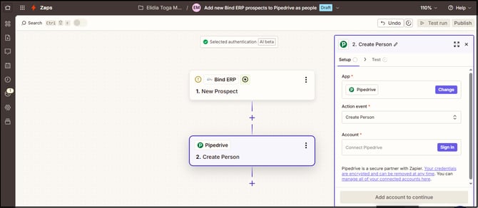Nota: Zapier muestra información de la última Person creada en Pipedrive como ejemplo de la información que se mandaría a Bind ERP para llenar los campos del nuevo Prospecto.