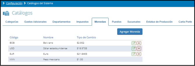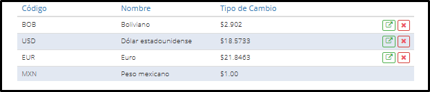 Si deseas editar o eliminar una moneda, haz clic en los íconos correspondientes ![]()