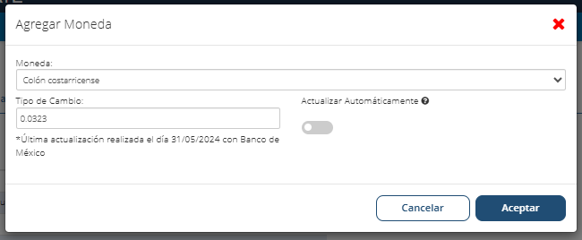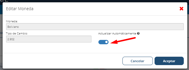 Ingresa manualmente el tipo de cambio vigente o activa la opción Actualizar Automáticamente.