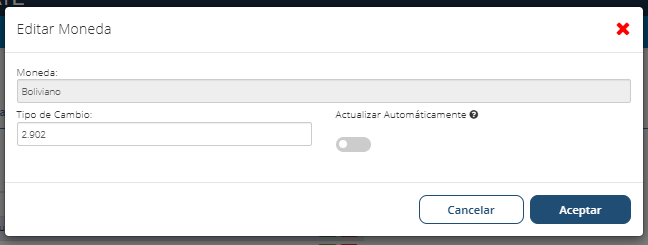 Al editar una moneda, se activará un campo para modificar su tipo de cambio.