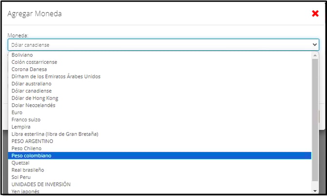 Esta sección está orientada a la incorporación de divisas, especialmente útil cuando tu empresa realiza operaciones comerciales en distintas monedas.
