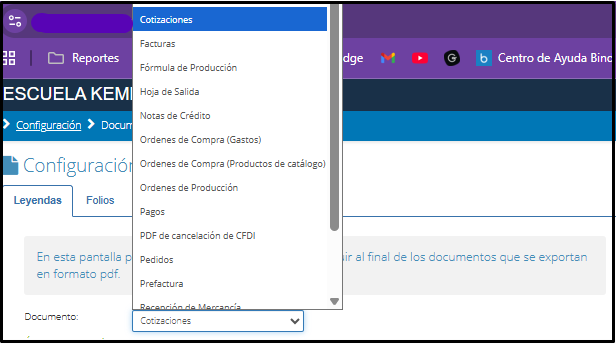 El módulo de Documentos te permite configurar los distintos tipos de documentos generados en Bind ERP, como cotizaciones, facturas, pedidos, notas de crédito, órdenes de compra, remisiones, entre otros. Desde aquí puedes personalizar la numeración (folios), las plantillas visuales y agregar leyendas a los documentos generados en PDF o tickets de venta.