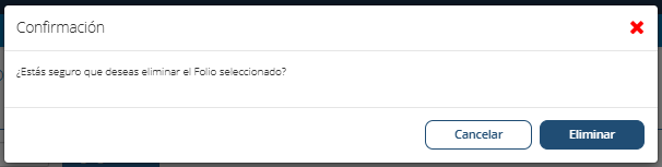 Para eliminar un folio, haz clic en el ícono de la X roja❌ y haz clic en Eliminar.